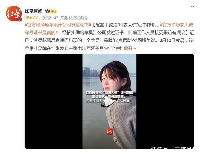 最近,演员赵露思因为一场“助农直播”被推上风口浪尖,剧情反转再反转,堪称现实版“罗生门”。 事情起因是赵露思在直播间推荐了一款苹果汁,品牌方自称是“助农大使”,结果网友一查,发现这个称号似乎“查无此人”,质疑声瞬间炸锅。8月13日凌晨,品牌方紧急甩出一张由陕西延长县农业农村局颁发的“助农大使”证书自证清白,结果网友又盯上了公章模糊的问题。 13日下午,事情突然“神转折”——有媒体报道称,延长县农业农村局工作人员表示“公章系伪造”,舆论瞬间爆炸。然而,当晚官方又火速澄清:证书是真的,但称号是给企业的,不是给赵露思个人的!