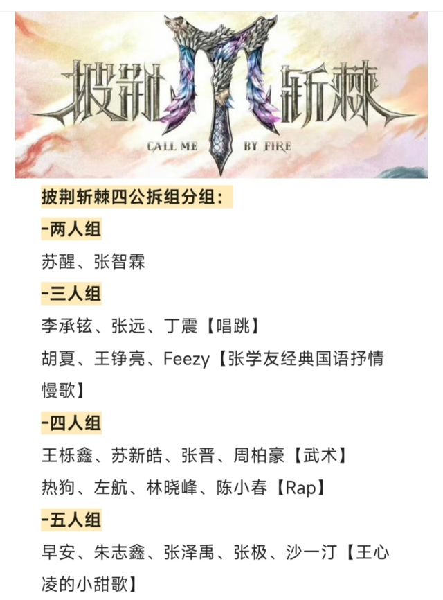 以上6个组将分别演唱不同类型的歌曲,比如:唱跳、慢歌、武术、说唱、小甜歌等等,看到节目组将“男团”打散,很多网友就已经意识到节目组想要干什么了。