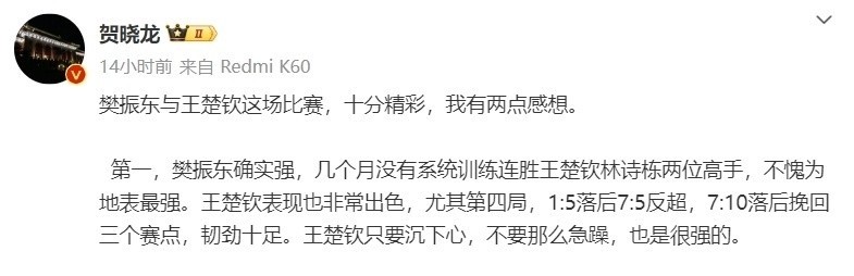 樊振东接连战胜林诗栋和王楚钦,也让知名记者贺晓龙在社交平台上感叹樊振东不愧是“地表最强”,他写道樊振东的实力确实强,几个月没有系统训练,还能在乒超联赛上接连击败王楚钦林诗栋两位高手,令人敬佩!另外贺晓龙也肯定了王楚钦的表现,能在多次落后的情况下反超甚至挽回三个赛点,这样的韧劲也是非常强的